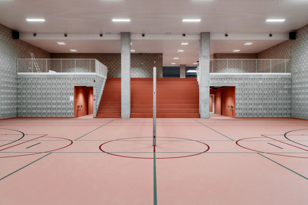 De sportzaal van de Mutsaardschool in Brussel combineert functionaliteit met exclusief design. In deze specifieke sporthal zijn Soundblox op organische wijze verwerkt in een bijzonder patroon. Daarbij zijn de akoestische blokken laag om laag gecombineerd met reguliere blokken in dezelfde maatvoering, wat een heel apart esthetisch effect oplevert.