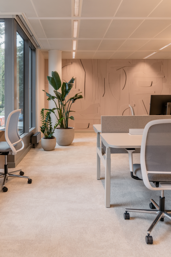 Een voorbeeld waarbij onderhoud minstens zo belangrijk is als de aanplanting zelf, is het atrium van het Passport Building op Brussels Airport. Hier zorgde Any Green voor de groene invulling van de door de architect ontworpen vaste plantenbakken. Na analyse van de ruimte werd geopteerd voor een uitgesproken groene ingreep met vijf volwassen Bucida-bomen – die volledig tot hun recht komen in een ruimte van deze grootte – in combinatie met Schefflera arboricola als onderbeplanting. Het onderhoud en de jaarlijkse bodemanalyses waarborgen de gezondheid van de bomen op lange termijn. Ook kleinere bedrijven hebben baat bij een doordacht groenplan. In het nieuwe kantoor van Burson werd samengewerkt met de interieurontwerpers van Alternativ om het warme, zachte interieurconcept te versterken met zorgvuldig gekozen kantoorplanten in organisch vormgegeven potten. Ze verzachten de strakke lijnen en voegen leven toe aan het kantoor. Wanneer het groen klopt, klopt ook de ruimte.