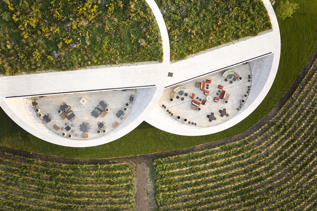 De functionele zones – fermentatie, opslag en techniek – liggen grotendeels ondergronds, waar de stabiele temperatuur optimaal is voor wijnproductie. De publieke zones – restaurant, bar en panoramische terrassen – bevinden zich in het bovengrondse gebouw. Dit wordt gekenmerkt door twee grote, lensvormige volumes van 36 meter breed, die op slanke stalen kolommen boven de helling lijken te zweven. De daken van deze volumes zijn uitgewerkt als groendaken die de glooiing van het terrein volgen, als een natuurlijke verlenging van het wijnlandschap. Het effect is dat de architectuur niet wordt ervaren als een afzonderlijk object, maar eerder als een doorlopende laag binnen het bestaande reliëf. Volgens hoofdarchitect Péter Bordás was het doel een gebouw te ontwerpen dat aanwezig is zonder de omgeving te domineren. De groendaken maken dit mogelijk: ze camoufleren de schaal van de constructie, versterken de illusie van een zwevende vorm en bewaken de continuïteit met het omliggende wijnlandschap. Opdracht geslaagd.