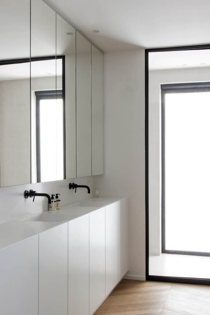La salle de bain constitue également une de ces pièces synonymes de calme, d’ambiance et de convivialité où échapper à la folie du quotidien. « Dans cette superbe maison de maitre, nous avons utilisé du solid surface dans la salle de bain. Un matériau facile à manier pour créer un ensemble épuré et uniforme. Nous avons fini les façades en mdf avec une laque satinée mate tandis que le plancher en bois vient réchauffer l’atmosphère de ce concept noir et blanc intemporel. Nous avons dissimulé la robinetterie dans les armoires pratiques à portes accordéons. Il était essentiel de préserver le caractère épuré. »